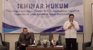 ”Tujuan seminar hukum ini untuk memberikan edukasi kepada peserta seminar dan masyarakat tentang sertifikat tanah elektronik yang merupakan program dari Kementerian Agraria dan Tata Ruang/Badan Pertanahan Nasional,” ujarnya.