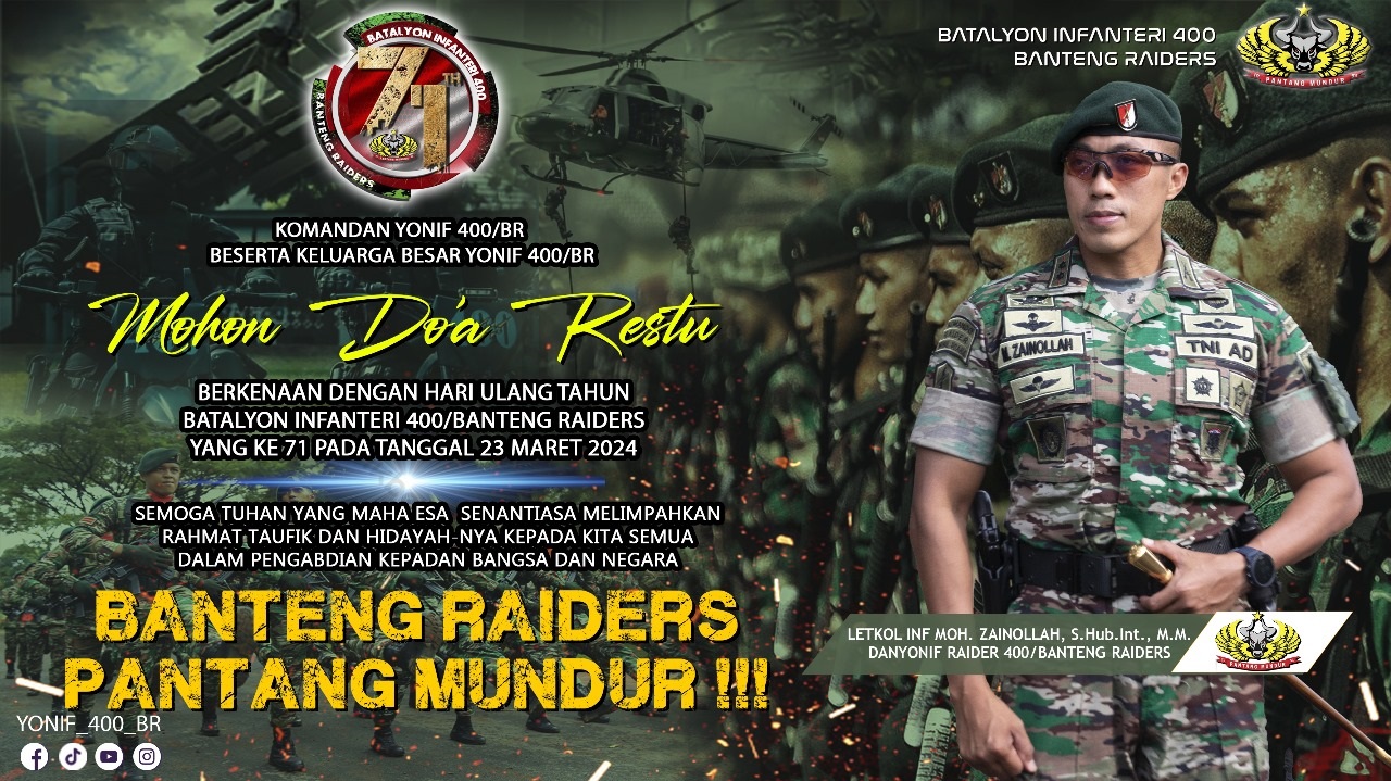 Komandan Batalyon Infanteri Raider 400/Banteng Raiders Letkol Inf Moh Zainollah juga ikut bangga dipercaya komando atas untuk memimpin satuan elite Kodam IV Diponegoro. “Batalyon Banteng Raiders ini telah mengisi sejarah panjang perjuangan bangsa Indonesia dalam peran serta membela kemerdekaan, dari operasi Trikora sampai operasi Perdamaian yang digelar PBB di beberapa negara yang berkonflik. Kalau tugas keamanan dalam negeri gak teritung lagi dari Aceh hingga Papua,” ujar Danyonif 400/BR.